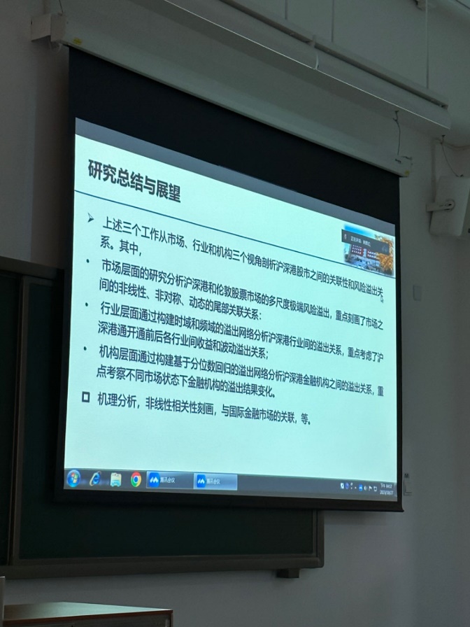 首先,姚老师介绍了她们对股票市场间的多尺度极端风险溢出的研究,她们构建了基于小波分解和时变copula模型的多尺度极端风险溢出方法模型,并分析了沪港深伦四个股票市场的多尺度极端风险溢出效应并比较了三种股市联通机制的影响。随后,姚老师介绍了她们对股市行业间的时频波动溢出的研究,做出了从时频视角研究沪港深股市的收益和波动率的溢出关系等贡献,并介绍了DY和BK溢出指数模型等的构建过程。然后,姚老师介绍了她们的第三项研究:金融机构间不同市场状态下的波动溢出研究,并详细介绍其研究目的、主要贡献、模型搭建及研究结论。最后,总结了文章的研究内容并对未来研究作出展望,向同学们展示了三方视角下对沪港深股市之间关联性和风险溢出关系的研究及其未来研究方向的展望。