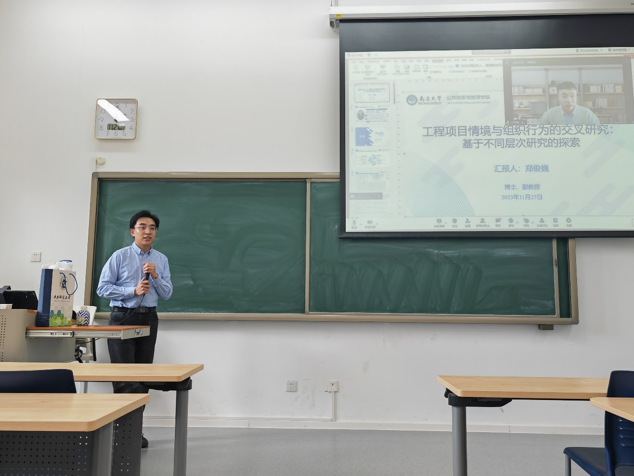 2023年11月27日下午,南昌大学郑俊巍副教授应邀在建设经济与管理系列论坛上作了题为《工程项目情景与组织行为的交叉研究:基于不同层次研究的探索》的线上报告。本次报告在沙河二教112教室举行,由哈哈体育建设经济与管理系助理教授吴国滨主持,工程与项目管理专业23级硕士生参加了讲座。