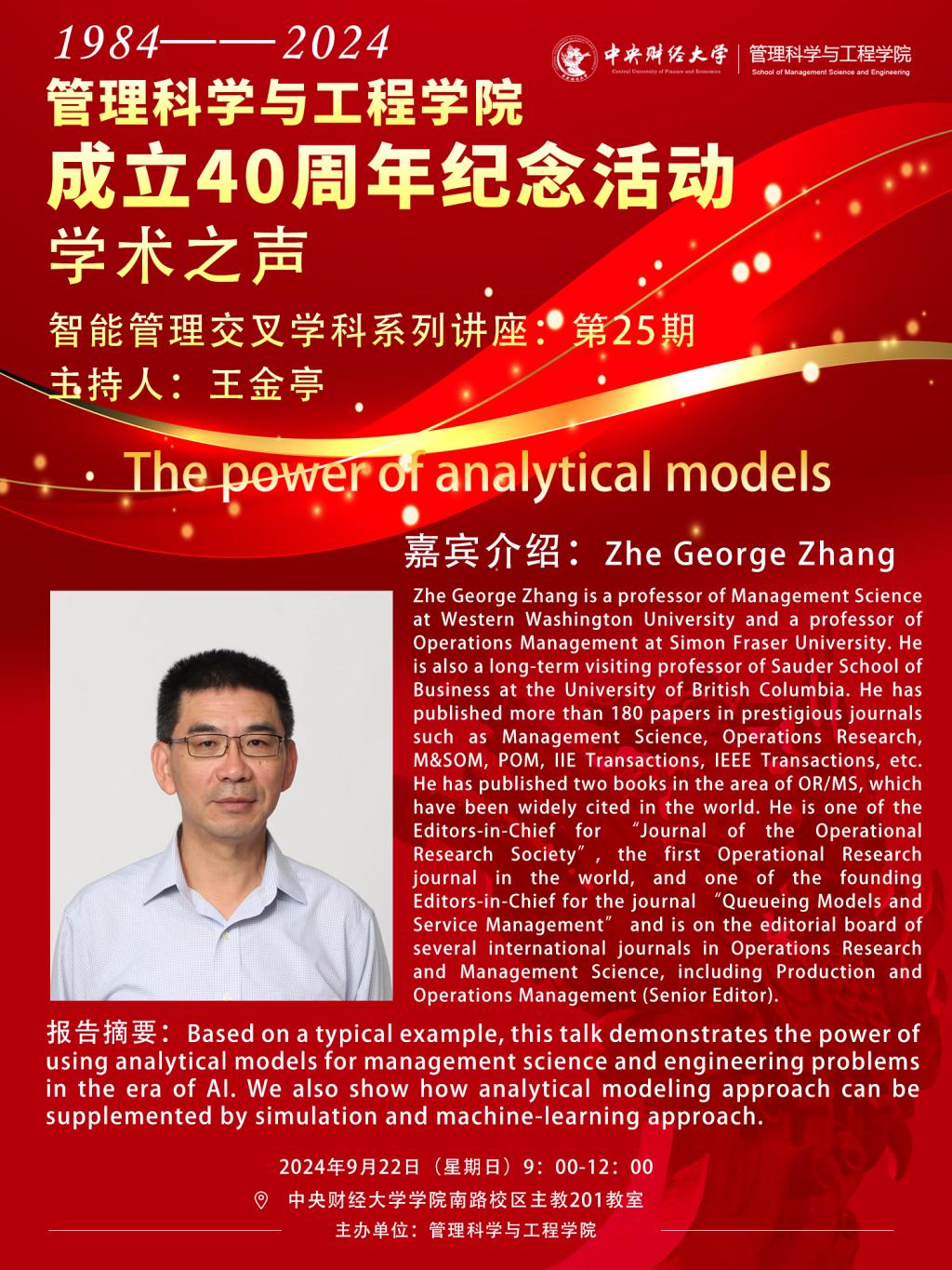 2024年9月22日(周日)上午,应哈哈体育的邀请,国际知名期刊《Journal of the Operational Research Society》的主编Zhe George Zhang(张喆)教授做了题为“The Power of Modelling Analysis an Investigation of the Impact of Prolonged Service Time on Flexibility Configurations”的智能管理交叉学科学术交流讲座。本次讲座在公司南路校区主教201教室举行,由王金亭教授主持,公司吴迪助理教授、北京化工大学李凯丽博士,以及哈哈体育多位博士研究生和博士后参加了本次讲座。