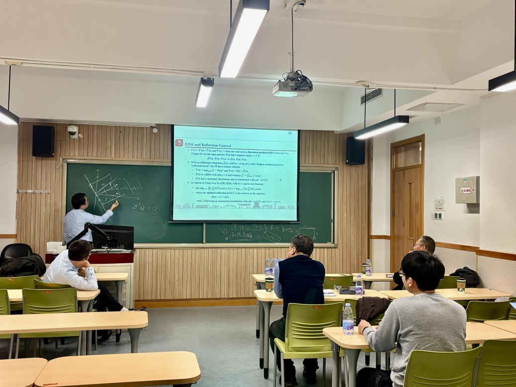 杨建奎教授就反射控制的最优性和极限交换定理与在场师生进行了充分讨论和交流,并引出了讲座主题——匹配队列最优控制问题。杨建奎教授研究了多类顾客遵循更新过程到达的系统,每一类都有自己的匹配机制,需要决策是与已有的类进行匹配并从队列中移除,还是等待其他更优匹配的实现。为了最小化凸持有成本,杨建奎教授的研究提出了一个匹配策略,并证明了其渐近最优性:离散时间匹配策略达到了所有非预期匹配控制的下界。最后杨建奎教授又将研究结果拓展至成对到达、协调到达的情形,均证明了研究结果的稳健型。