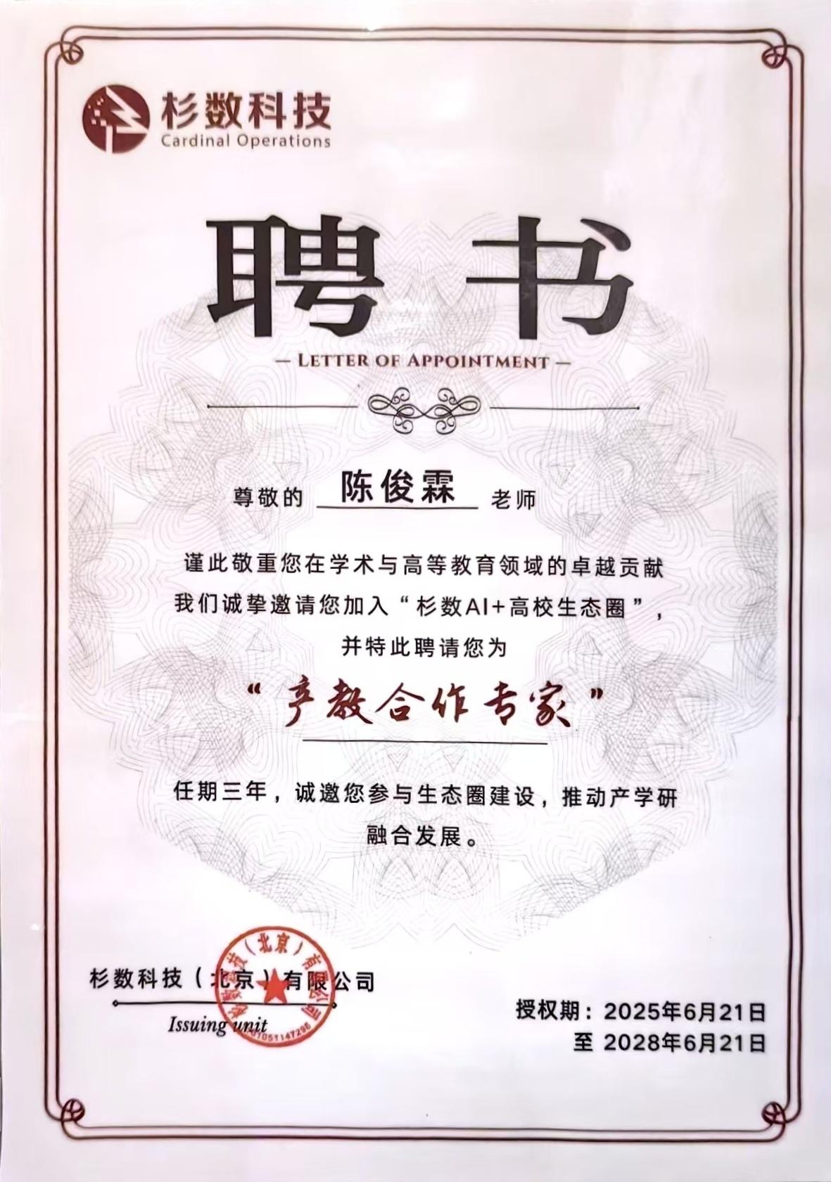 陈俊霖教授正式受聘为杉数科技的产教合作专家,体现了公司在深化产教融合和加强与行业合作方面的持续努力。杉数科技作为技术领先的企业,将为公司提供技术支持和行业视野,助力提升公司在智能决策、大数据等领域的教学和研究水平。此次合作将促进学科发展,培养更多具备创新能力的高素质人才,为社会科技进步和经济发展做出积极贡献。