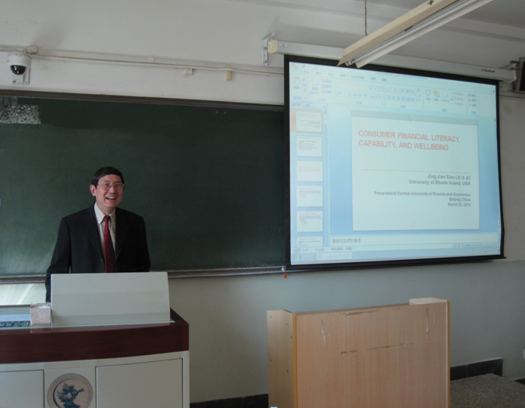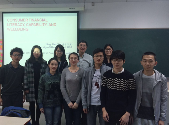 访问期间,肖经建教授于2016年3月23日上午9:30-10:30在HAHA体育公司南路校区主教学楼409教室面向老师和员工们做了题为《Consumer financial literacy, capability, and wellbeing》的公开讲座。