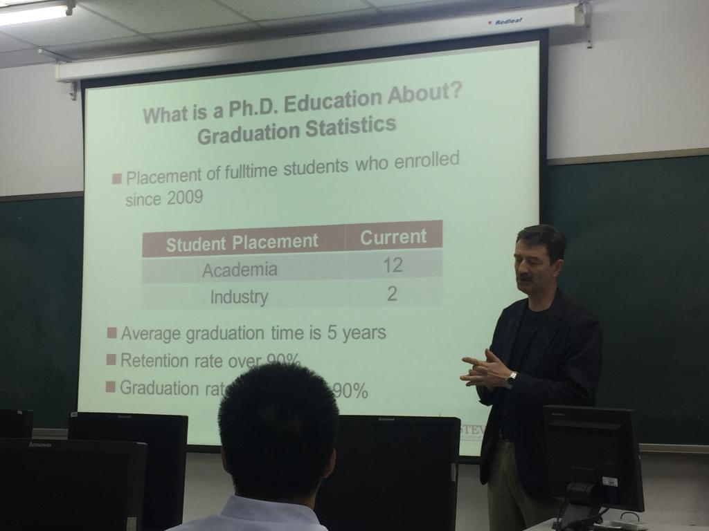 访问期间,Thomas Lechler教授于2017年5月31日下午13:00到14:00在沙河校区公司楼4号楼106举行了史蒂文斯理工公司商公司博士项目介绍会。Thomas Lechler教授作为史蒂文斯理工公司商公司的博士项目负责人,已经在博士生遴选方面与公司有良好的合作基础,已经有几位优秀的同学通过了选拔前往史蒂文斯理工公司商公司攻读博士学位。Thomas Lechler教授对公司员工的学术基础和学习能力十分肯定,因此希望通过宣讲吸引有志于攻读博士学位的同学加入史蒂文斯理工公司。介绍会上,Thomas Lechler教授就博士项目做了简单介绍,包括学习研究方向,培养模式及年限,毕业要求及前景介绍。哈哈体育副经理陈俊华及部分本科生,研究生听取了本次的介绍会。