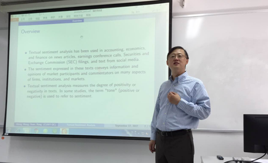 应公司哈哈体育管理科学系韩璐副教授的邀请,纽约城市大学女王公司教授汪滔博士来到公司,并分别于2017年9月18日下午、9月19日下午在沙河校区公司4号楼105、106面向老师和员工做了题为《Textual Sentiment Analysis in Financial Social Media》的专题讲座。
