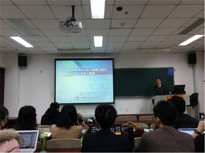 2019年11月20日上午,中国国际工程咨询有限公司社会事业业务部原部门副主任、正高级工程师、中国首批注册监理工程师王迁应邀来访公司。王迁教授根据其多年来的建筑维修改造工程评估、方案设计与咨询的工作经验,为公司师生开展了以“从中国国家博物馆改造与重建过程中,感知投资决策的艰难与重要”为主题的讲座。该讲座由工程管理系主任李玉龙副教授主持,工程与项目管理专业2019级全体研究生参与学习。