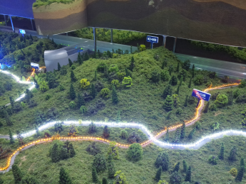 随后,我们进入了沙盘室,参观整个工程的实物模型。邹经理具体介绍了模型细节,并表示该工程属国内首次岩体综合管廊项目,施工工期短,施工难度大,技术要求高,组织协调复杂。该项目采用大型自动施工机械TBM(Tunnel Boring Machine)隧道掘进机,TBM是利用回转刀具开挖,同时破碎洞内围岩及掘进,形成整个隧道断面的一种新型、先进的隧道施工机械。相对于常用的方法,TBM集钻、掘进、支护于一体,使用电子、信息、遥测、遥控等高新技术对全部作业进行制导和监控,使掘进过程始终处于最佳状态。有效的保障了综合管廊项目的工期、成本及质量要求,为服务冬奥提供了有力的支撑。