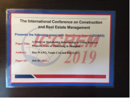 第二天上午,参会团聆听了各分会场的报告,并积极参与讨论;下午,符莎莎和滕健健先后在”Construction Industrialization and Sustainability”分会场进行了主题为“Analyzing Affordable Housing Industrialization Status in Beijing from the Perspective of Energy Saving and Emission Reduction”和“Quantifying the Green Efficiency of the Construction Industry in China”的发言,引起了参与人员的广泛关注,对论文的选题、研究方法和研究结论等方面进行了详细的讨论,并收获了许多建设性的意见和建议。在当天晚上举行的宴会上,进行了优秀论文的颁奖典礼,王昊、蔡雅琴和高然的论文“AStudy on Stakeholder Relationship in Urban Renewal Projects:Case of Tianzifang in Shanghai”荣获“Best Paper Award”,由蔡雅琴代表其他作者上台领奖。