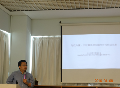 期间,陈俊华副教授受邀在香港中文大学中国研究中心与中国研究服务中心做了专题学术报告。陈俊华副教授在近2小时的时间里详细介绍了中国大陆地区的财政分权体制、中央与地方的相机授权机制以及这些因素对中国保障性住房供给效率的具体影响。这次专题学术报告吸引了来自香港中文大学、香港城市大学、香港浸会大学和香港教育公司的相关学者及同学参与,展示了陈俊华副教授主持的国家自然科学基金面上项目的阶段性研究成果。专题学术报告会后,陈俊华副教授还分别与香港中文大学Yihong Jiang博士和香港城市大学的Ngai Ming YIP教授进行了会谈,就员工交换与博士生联合培养达成了初步合作意向。