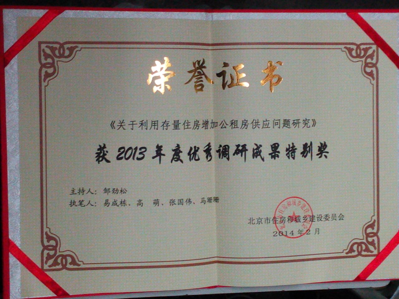 由公司城市与房地产管理系易成栋教授主持、硕士生高萌等参与的北京市住房和城乡建设委员会合作课题《关于利用存量住房增加公租房供应问题研究》获该委2013年度优秀调研成果特别奖。