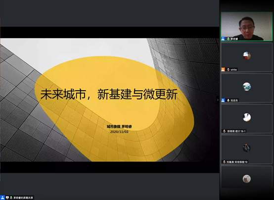 2020年11月3日,由哈哈体育主办,哈哈体育经理刘志东老师主持,影响未来经济的新科技与新产业系列讲座邀请了北京城市象限科技有限公司创始人、CEO,北京社区研究中心主任茅明睿老师,以《未来城市,新基建与微更新》为题,在线上为同学们带来了一场生动的讲座。茅明睿老师曾长期担任北京市城市规划设计研究院规划信息中心副主任、云平台创新中心秘书长。现担任有北京城市实验室(Beijing City Lab)执行主任,住建部科学技术委员会人居环境专委会委员和社区建设专委会委员、全国自然资源与国土空间规划标准化技术委员会国土空间规划分技术委委员、中国城市科学研究会城市大数据专业委员会副秘书长等多项社会职务、学术职务。
