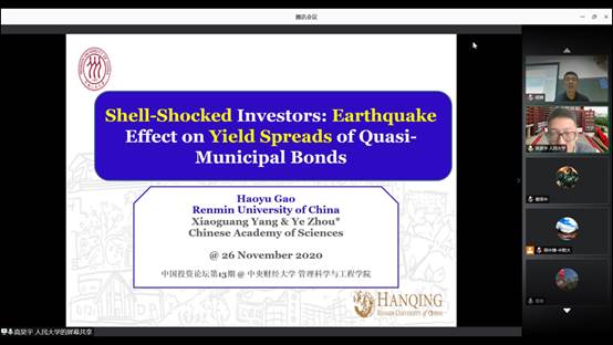 高昊宇副教授发表了题为“Shell-Shocked Investors:Earthquake Effect on Yield Spreads of Quasi-Municipal Bonds”的主题演讲。近年来以地震为代表的极端自然灾害风险越来越受到各界重视,这种风险如何被金融市场感知、定价,是具有很高价值的研究问题。基于此,高昊宇副教授基于对现有关于地震经济损失与风险感知后果文献梳理的基础上,重点介绍了行为金融领域中的“Salience bias”与“Projectionbias”理论,生动阐述了论文的理论机制并提出研究假设。随后,高昊宇教授介绍了论文的数据以及实证结果。研究表明:过去一段时间的破坏性地震会显著提高当地城投债的风险溢价,但该作用只在短期内有效,且该效果会随着投资者对当地地震预期的提高而降低,进一步论证了“Salience bias”在该作用机制中的核心地位。