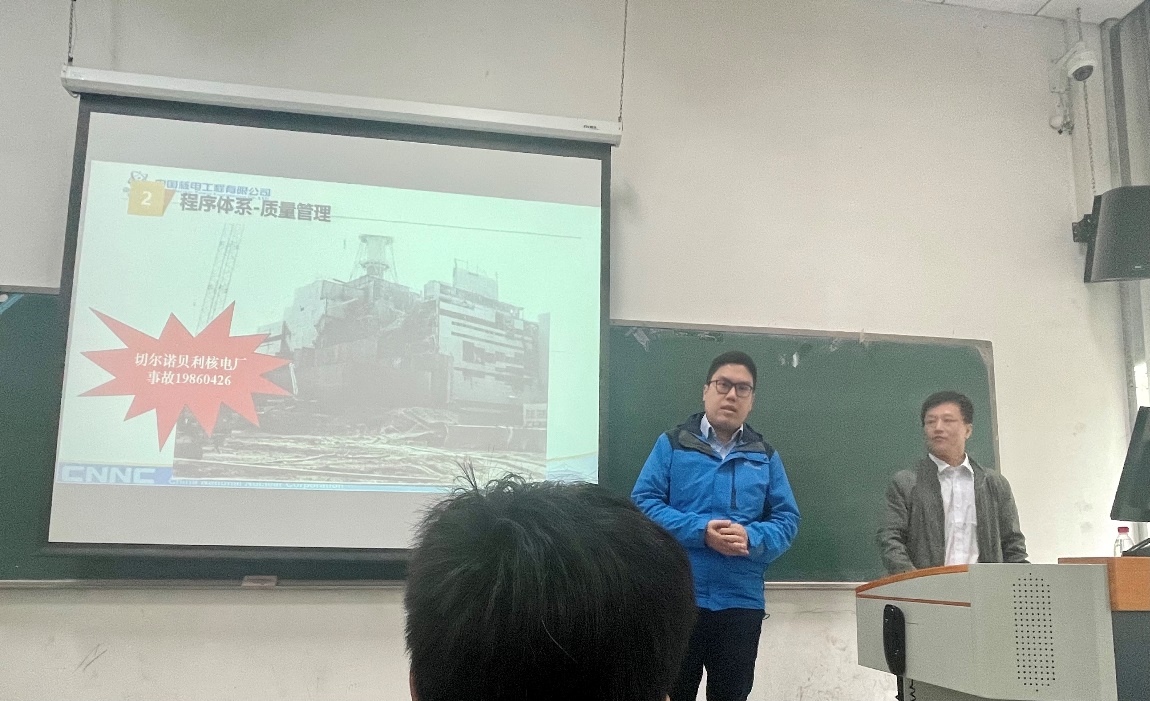 报告分为核电基础知识、核能发展情况及“华龙一号”建设管理情况三部分。首先,徐春富主任从核裂变与核聚变的反应原理出发,向同学们介绍了目前主流的核能源研究及应用现状。随后,徐总讲解了目前世界上各国核电技术的发展情况,特别是中国核电技术的艰难发展历史,让同学们感受到祖国核电发展到现在世界领先地位的不易。同时,徐总介绍了世界上有名的三次核电站事故,以及我国在其中吸取的经验教训,为“华龙一号”的管理与实践创新奠定了基础。