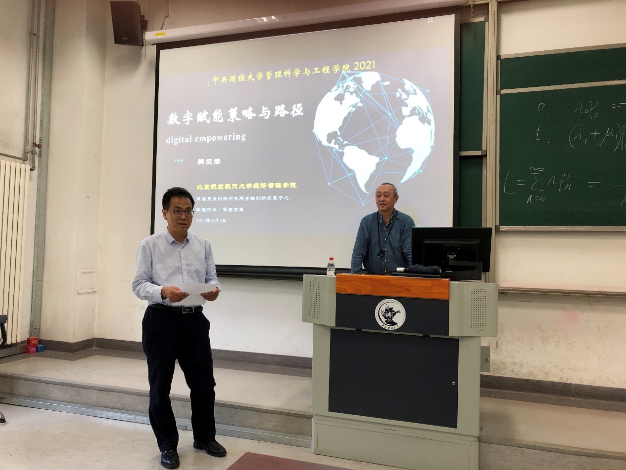 2021年6月3日(周四)下午16:00—18:00,北京航空航天大学经济管理公司韩立岩教授在HAHA体育(沙河校区)主教109,开展了题为“数字赋能策略与路径”的学术交流讲座。哈哈体育刘志东经理,管理科学系井帅老师、韩璐老师、魏璐老师、迟钰雪老师、刘赫老师,投资系荆中博老师,以及哈哈体育部分本科生及硕士博士研究生同学聆听了讲座。
