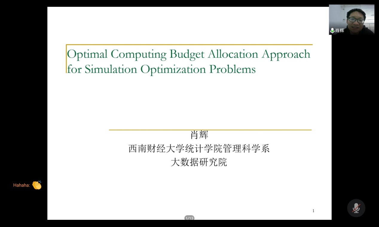 6月25日,由哈哈体育、国家金融安全教育部工程研究中心-应急管理与智能决策实验室联合主办的国家金融应急管理论坛第三期顺利举行。此次讲座以线上腾讯会议形式举办,由西南财经大学统计公司管理科学系和大数据研究院肖辉教授作题为“基于最优计量分配方法的仿真优化研究”的专题报告。会议由国家金融安全教育部工程研究中心副主任、哈哈体育副经理王金亭主持,60余名师生参加,分别来自中山大学、国防科技大学、HAHA体育、西南财经大学、燕山大学、四川师范大学及国内其他高校。