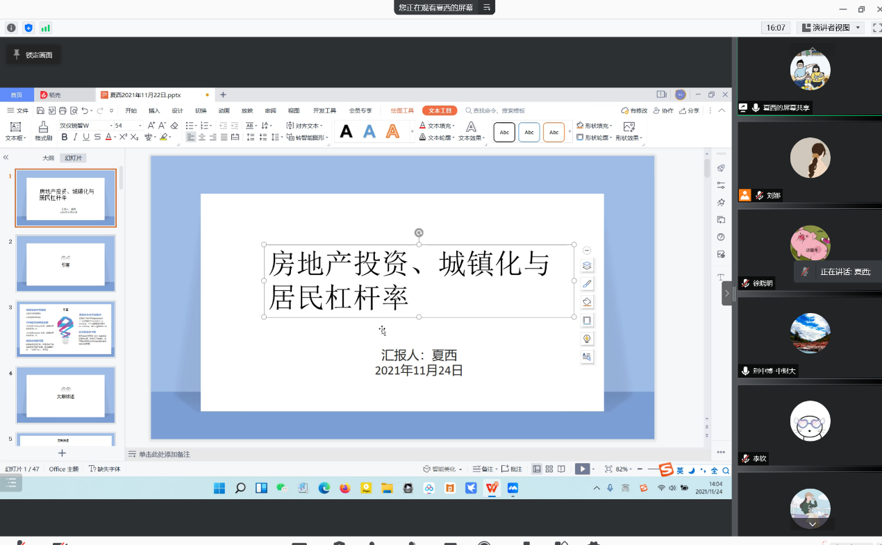 论文报告环节,公司2018级博士研究生夏西以“房地产投资、城镇化和居民杠杆率”为主题进行了报告。他利用面板数据双向固定效应模型和面板数据中介效应模型识别出在我国城镇化率快速提高的过程中,居民部门的负债实际上成为了支撑土地城镇化发展的重要资金来源,而房地产投资在该过程中起到了关键的中介作用。王志锋教授针对汇报内容,从标题设计、实证数据的时间跨度、变量选择、回归模型设计等多个方面对该论文进行了全面详细的点评,并提出了中肯的修改建议。