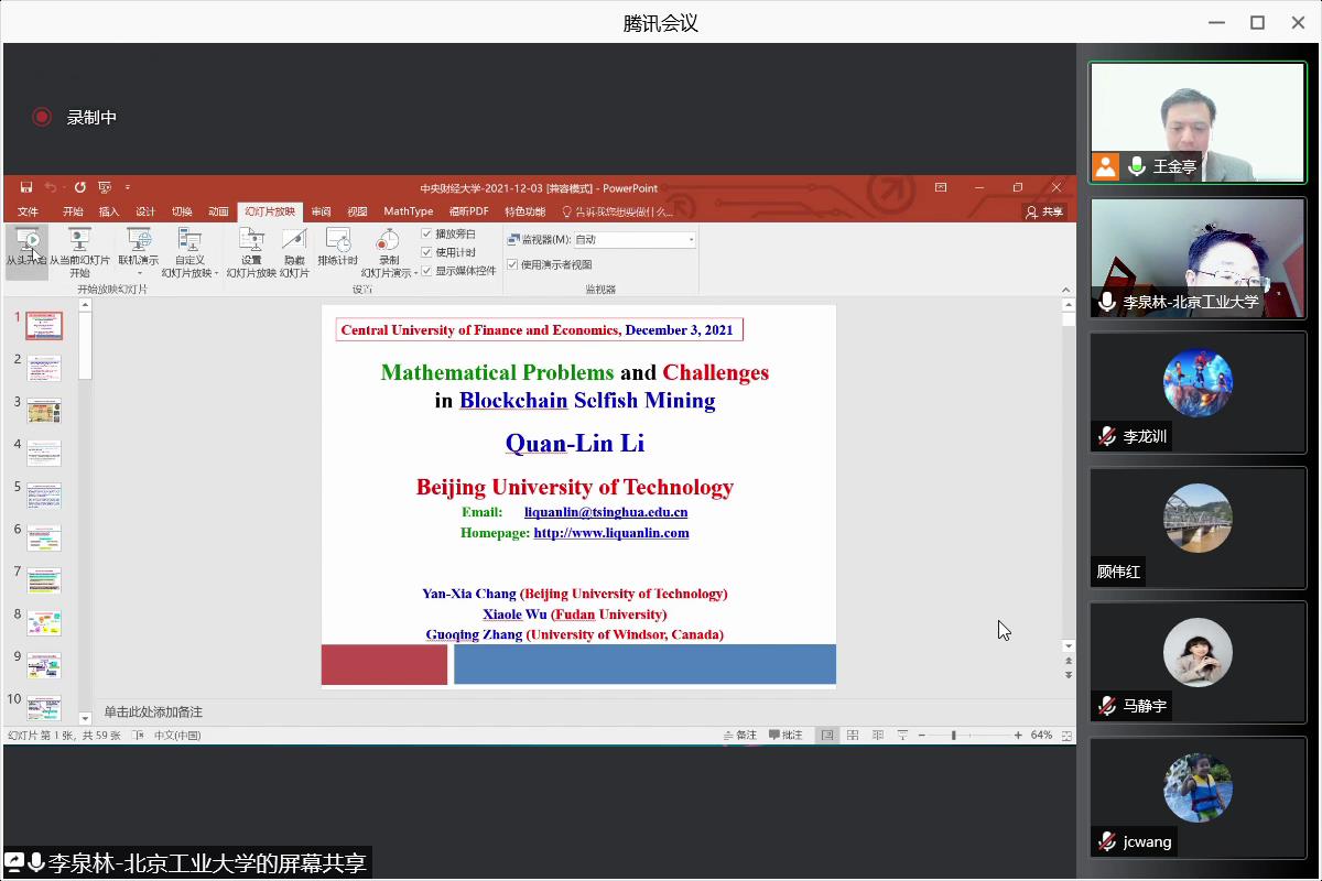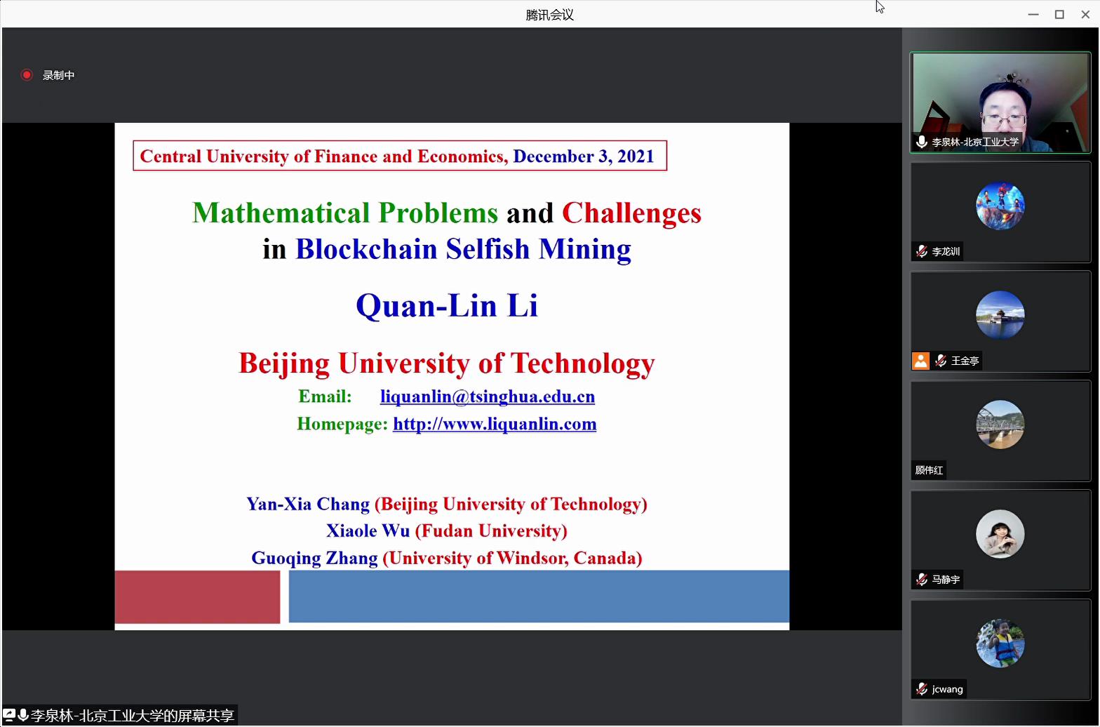 2021年12月3日(周五)下午,北京工业大学经济与管理公司李泉林教授为哈哈体育师生作题为“Mathematical Problems and Challenges of Blockchain Selfish Mining”的专题讲座,本次讲座由哈哈体育副经理王金亭教授主持,复旦大学管理公司教授吴肖乐、哈哈体育助理教授刘赫、公司部分博士、硕士研究生和院外同行参加了讲座。