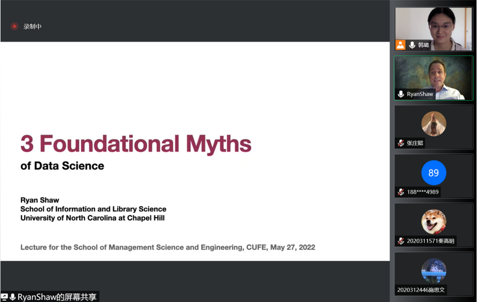 Associate Professor Ryan Shaw (Undergraduate Program Coordinator at School of Information and Library Science in University of North Carolina at Chapel Hill) was invited to give a lecture on "Three Foundational Myths of Data Science" at 8:00 am on 27 May 2022(Beijing time). The lecture was hosted by Lu Han, and nearly 100 undergraduate and graduate students participated in the lecture.