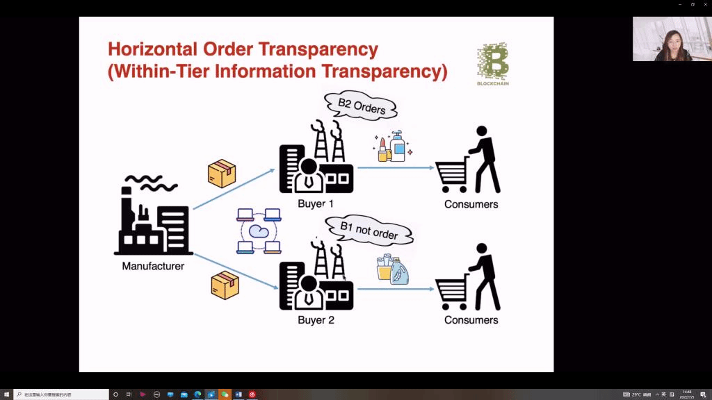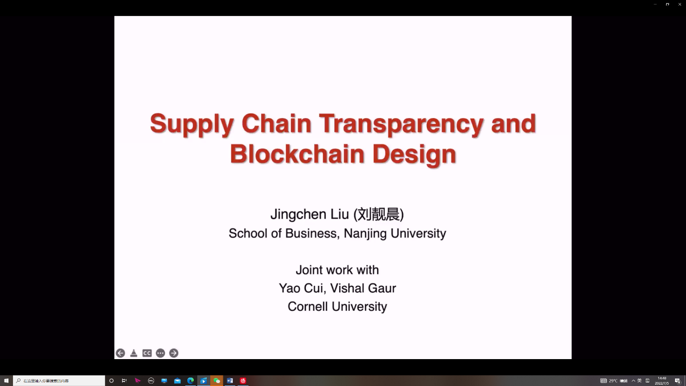 2022年7月4日(周一)下午15:00—16:30,来自南京大学商公司工商管理系的助理教授刘靓晨于线上开展了题为“Supply Chain Transparency and Blockchain Design”的学术交流讲座。讲座由哈哈体育副经理王金亭教授主持,哈哈体育经理刘志东教授,以及哈哈体育、商公司相关老师、研究生参加了此次讲座。