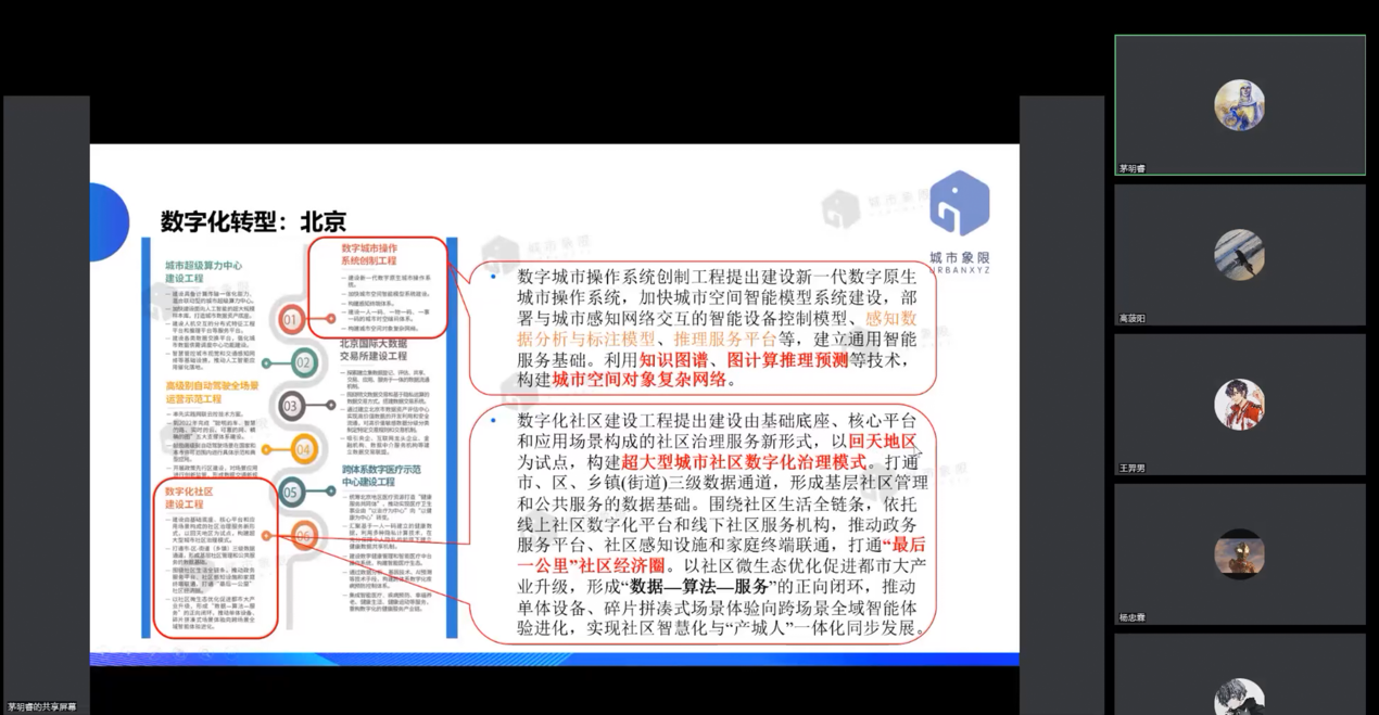 随后茅明睿老师对认知计算这一城市治理新趋势进行了详细的讲解。首先以北京市建设数字经济标杆城市为例,列举六大标杆项目,包括城市超级算力中心、高级别自动驾驶全场景运营示范、数字化社区、数字城市操作系统、北京国际大数据交易所、跨体系数字医疗示范中心建设工程。接着对比介绍上海的数字化转型规划,总结出数字化转型“城市操作系统”的三大共性关键词,即复杂系统、空间对象单元、知识图谱。城市治理价值目标具有复杂性,需要运用数据驱动进行治理,在评价治理效果时,应综合考虑维度的综合性、频度的规律性、广度的全面性以及密度的协同性。在具体操作层面,结合传统数据、数字社会和数字政府建立全感知城市。通过介绍街景数据的价值和处理过程、以及北京各公共热线的特征,茅明睿老师为同学们详细讲解利用城市体征数据构建知识图谱的过程,知识图谱的建立可以帮助政府更好地进行决策。随后,茅明睿老师对元宇宙进行了描绘,运用CIM数字孪生平台,将真实世界的三维模型植入游戏引擎中,用游戏的思维讲解了如何鼓励更多人参与营造未来城市。