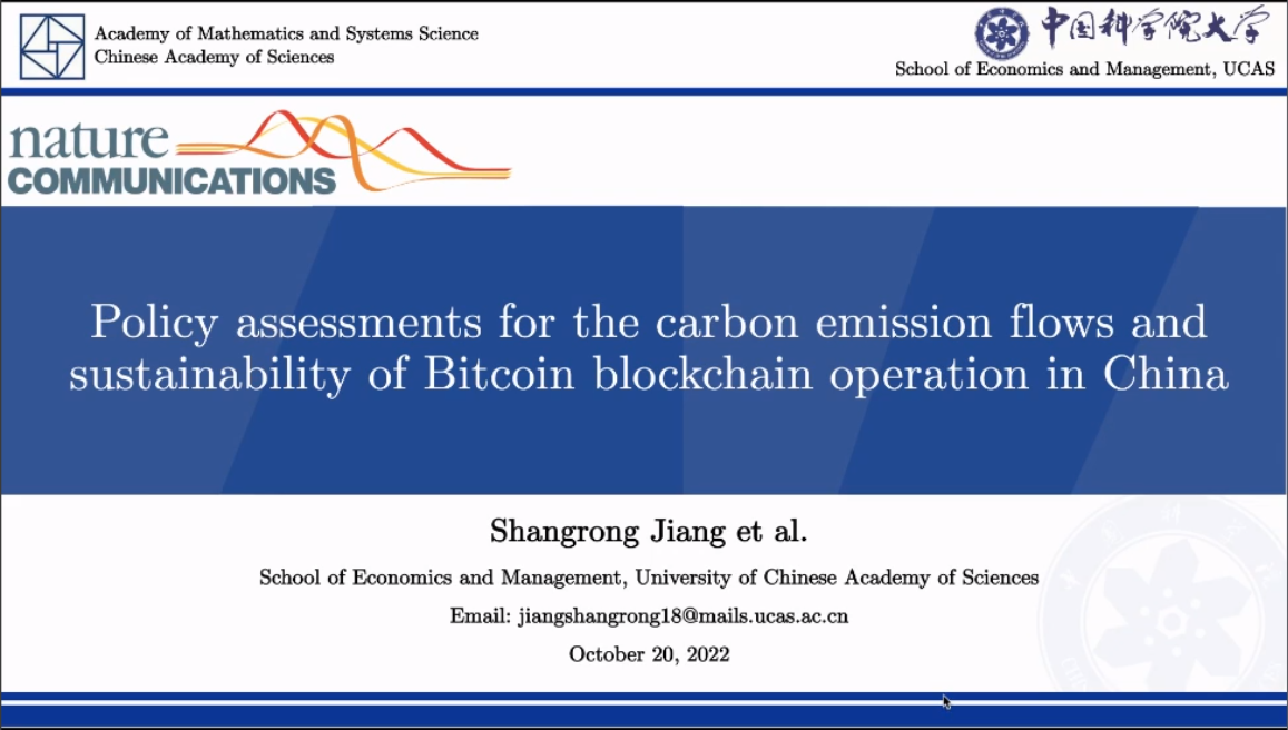 在本次讲座中,姜尚荣分享了自己的选题动机、研究方法、研究模型与研究结论。在针对中国比特币区块链运营的碳排放流和可持续政策评估的分享中,姜尚荣谈到,区块链中产生的碳排放问题不可忽视,而我们却很难发现在其过程中碳排放是怎样产生的。为了实现有效的可持续发展,基于系统动力学的研究,姜尚荣及其合作者提出了区块链市场准入政策、矿石管制政策以及碳税政策等方案,拟合分析不同政策的有效性,构建出完整的理论体系BBCE模型,对中国区块链的发展做出重要贡献。