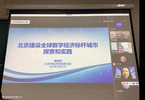 2022年10月27日,由哈哈体育主办,哈哈体育迟钰雪老师主持,影响未来经济的新科技与新产业系列讲座邀请了北京市经济和信息化局唐建国老师,以《北京建设全球数字经济标杆城市探索和实践》为题,在线上为同学们带来了一场生动的讲座。唐建国老师现任北京市大数据中心副主任,兼任北京市经济和信息化局大数据应用与产业处处长,曾任市经信委研究室(政策法规处)主任、产业结构调整处(区域合作处)处长。