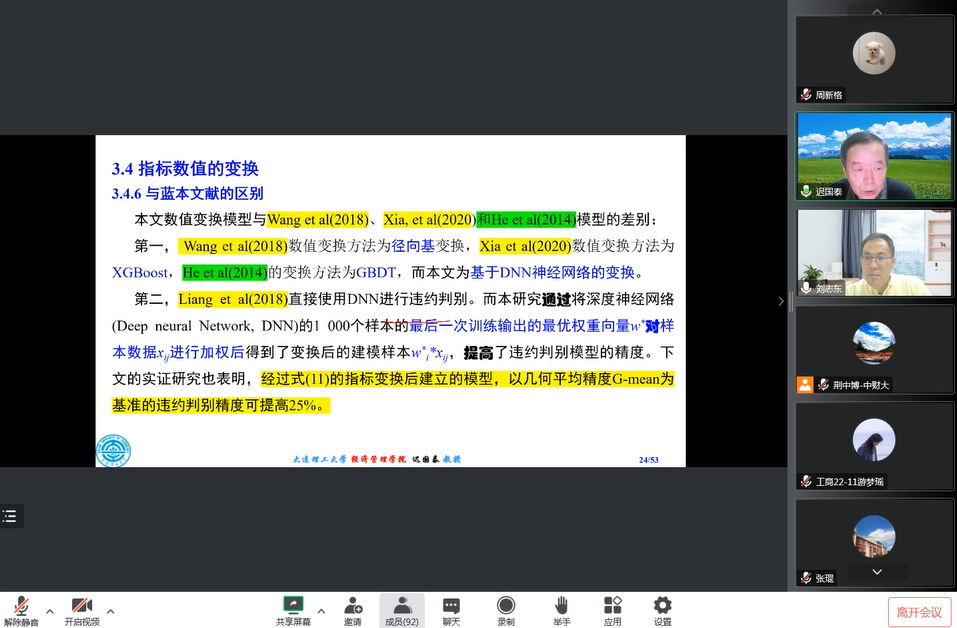 2022年11月24日,大连理工大学文科领军人才、大连理工大学经济管理公司金融学二级教授迟国泰应邀做客公司管理科学与工程系列高端讲座,为公司师生作线上学术报告。本次讲座由哈哈体育经理刘志东主持,共90多位师生聆听了本次报告。
