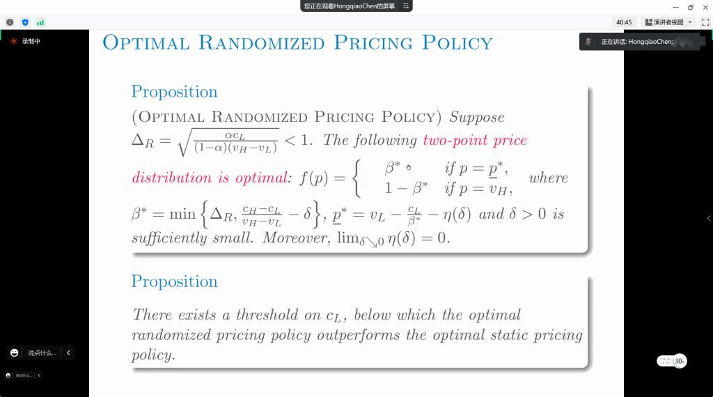 本次讲座中,陈虹桥博士首先构建了跨期价格歧视模型,建立优化的目标函数后并求解,得出最优定价分布属于两点分布,并将最优价格分布描述为随机促销策略,高支付意愿顾客在到达时将立即以正常价格购买,而低支付意愿顾客将等待随机促销。接着,陈博士给出了所有确定性定价策略的策略空间内的最优策略是周期性定价策略并将其与最优随机定价策略进行比较,得出在低支付意愿顾客足够耐心且高、低支付意愿顾客的绝对差异足够大的情况下,最优随机定价策略优于统一定价策略。