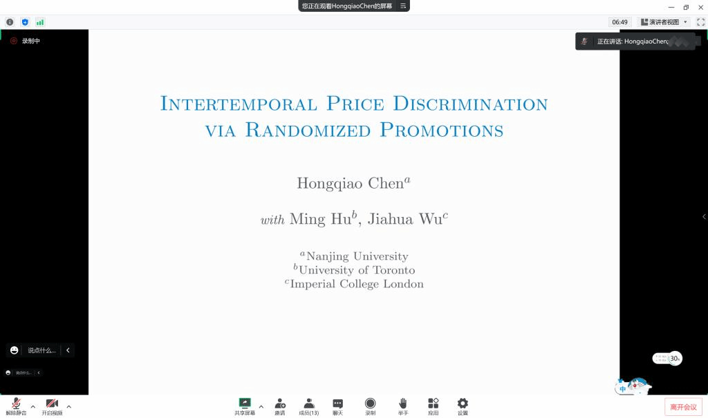 2022年11月27日下午3时,南京大学工程管理公司陈虹桥助理教授应邀为公司师生作了一场题为“Intertemporal Price Discrimination via Randomized Promotions”的学术讲座。本次讲座由哈哈体育副经理王金亭教授主持,经理刘志东、商公司、哈哈体育多位老师、研究生、本科生参加了此次讲座。
