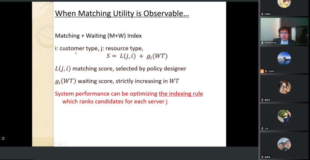 王金亭教授致欢迎辞,介绍了丁弋川副教授的教育背景和研究经历,欢迎丁弋川副教授就其投稿于顶级期刊Operations Research上的研究工作线上给与会师生和国内学者介绍资源顾客匹配问题的前沿研究,加强学术交流与合作。丁老师对中财管工公司的邀请和王金亭教授的介绍表示感谢。