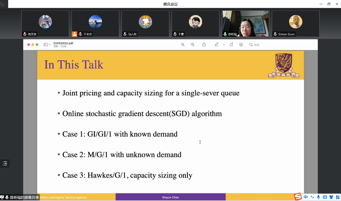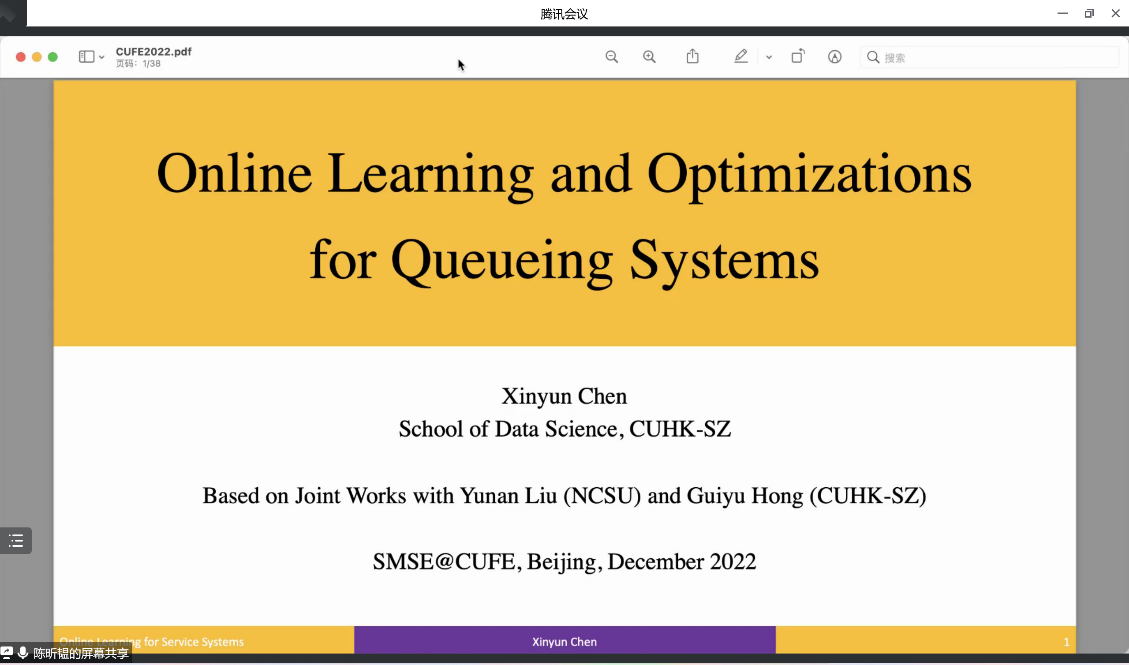 2022年12月15日下午15时,香港中文大学(深圳)数据科学公司副研究员陈昕韫博士应邀为公司师生作了一场题为《Online Learning and Optimization for Queueing Systems》的智能管理交叉学科系列讲座(第15讲)。本次讲座由公司王金亭教授主持,近五十位海内外学者和公司师生参与了此次讲座。