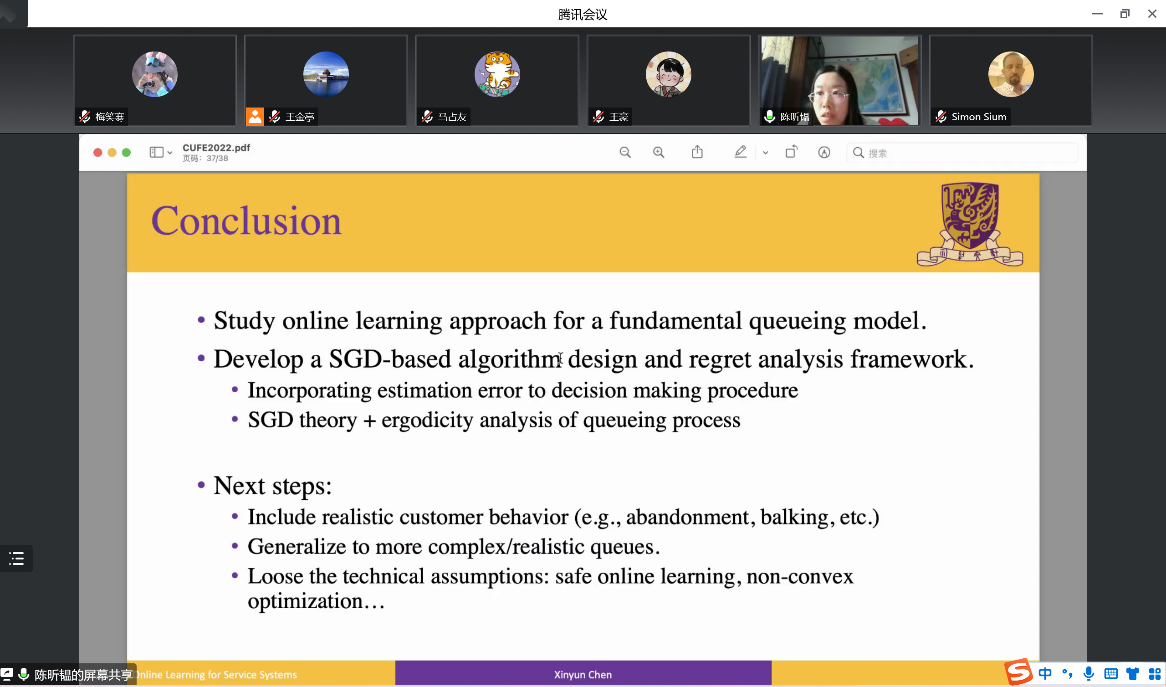 陈昕韫博士的讲座内容丰富,条理清晰,深入浅出,前沿性强。在讲座交流环节多位参会者向陈博士请教了有关模型刻画和应用的相关问题,陈昕韫博士做了详尽的解释和说明,现场互动交流氛围热烈。与会者均表示对排队论和在线学习结合领域的研究有了更全面更深刻的认识,受益匪浅。李泉林老师和王金亭教授表示今后待疫情缓解后再邀请陈博士来北京线下指导工作,促进HAHA体育管工公司和香港中文大学之间的学术交流与合作。王金亭教授表示非常有幸可以邀请到陈昕韫老师为各位师生学者做线上讲座,并对陈老师抽出宝贵时间表示感谢,讲座水平非常高超,让在场师生受益匪浅,并对陈博士的身体状况表达了关心,希望之后有机会可以再次邀请陈老师前来做学术讲座。