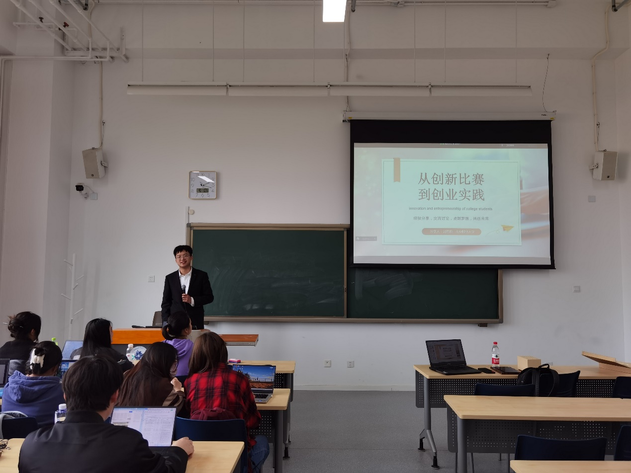 接下来,刘巴特同学结合自身初高中教育公司、“树洞”全国老员工心理论坛、NEW CASE校园剧本杀连锁品牌、万众聚量科技有限公司四段创业历程,与同学们分享了从创新比赛到创业实践的经验与心得,并在最后向大家提出了一个创业经历中遇到的真实问题,供大家交流思考。
