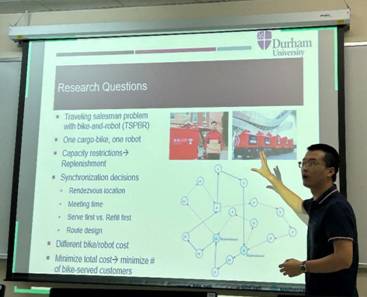 9月15日下午,应哈哈体育邀请,英国杜伦大学商公司运营管理专业助理教授赵燕鲁做客“智能管理交叉学科”系列讲座第十七期,报告了研究论文“Synchronized Deliveries with a Bike and a Self-Driving Robot”。本次讲座在公司4号楼106教室举行,陈俊霖副教授主持,管理科学23级研究生和数名本科生认真聆听了本次讲座。
