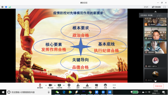 为隆重庆祝中国共产党建党99周年,回顾党的光辉历程、讴歌党的丰功伟绩,深入学习贯彻习近平新时代中国特色社会主义思想和党的十九大精神,不忘初心、牢记使命,以饱满的政治热情迎接建党100周年,2020年7月3日,哈哈体育管理科学系教工党支部在线举行了“从疫情防控看党员先锋模范作用的发挥”主题党日活动。活动分为两个部分,首先,通过腾讯会议平台,管理科学系教工党支部党员老师们针对在志愿服务活动、在线教学、科学研究、社区治理、垃圾分类等工作中起到的战斗堡垒作用和党员先锋模范作用,进行了工作经验分享和心得体会交流。如一些党员老师分享了在社区参加志愿服务的工作经历和感想,一些党员老师分享了与毕业员工沟通,打包邮寄材料工作中的心得感想。通过经验分享,进一步增强了党员老师的宗旨意识,努力做好“疫后综合征”分析研判和对策研究,努力实现2020年各项工作发展目标任务。
