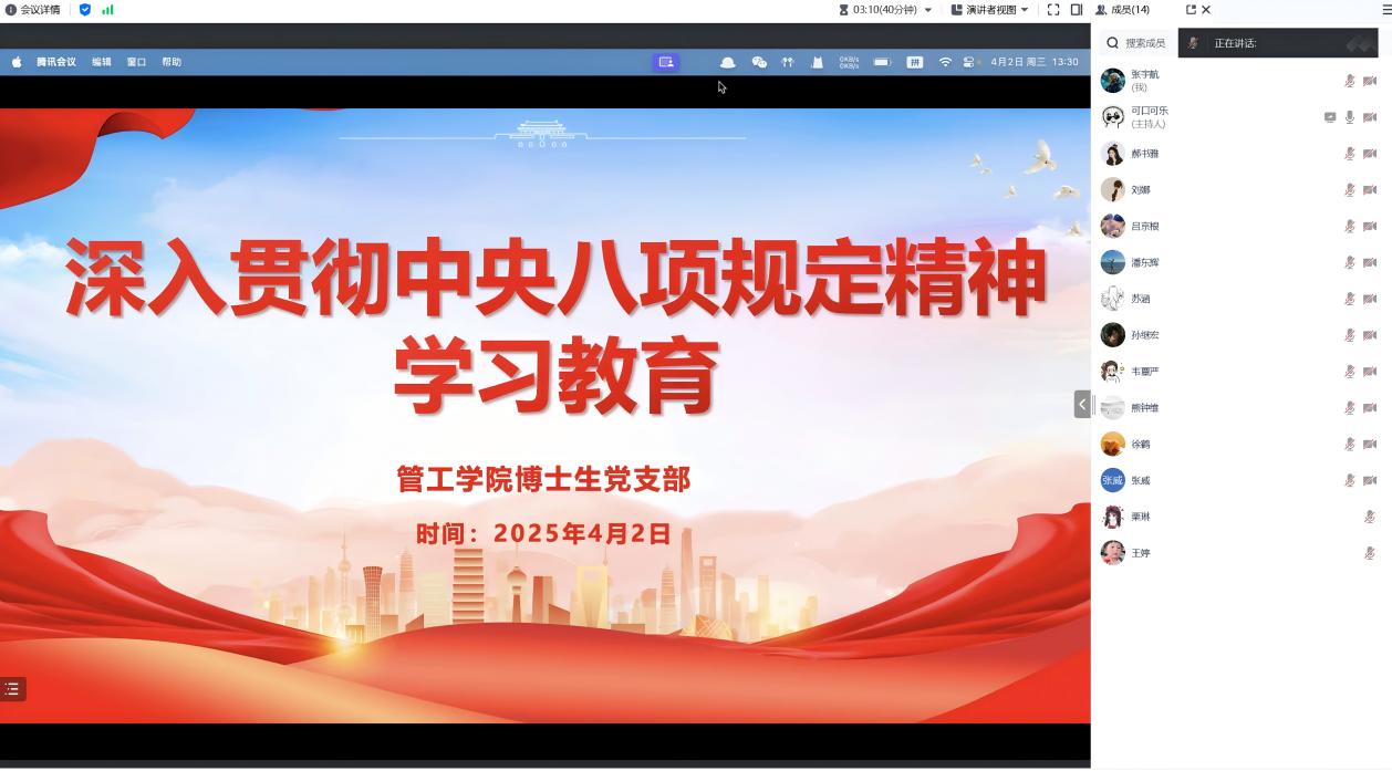 4月2日中午,哈哈体育博士生党支部在线上组织开展深入贯彻中央八项规定精神学习教育,14名党支部成员参加了此次专题学习。