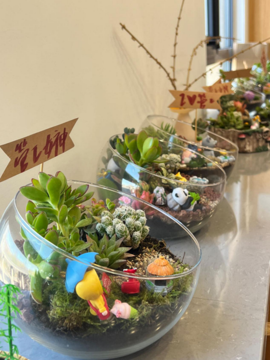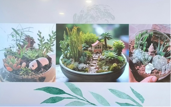 经过大家的亲手实践,一件件创意十足的多肉微景观作品展现在大家眼前,令人赏心悦目。小小一株盆栽盛满了对生活的热爱,一土一铲都承载着对美好生活的向往与期望。欣赏着自己亲自制作出来的作品,大家的脸上都洋溢着喜悦欢快的笑容。