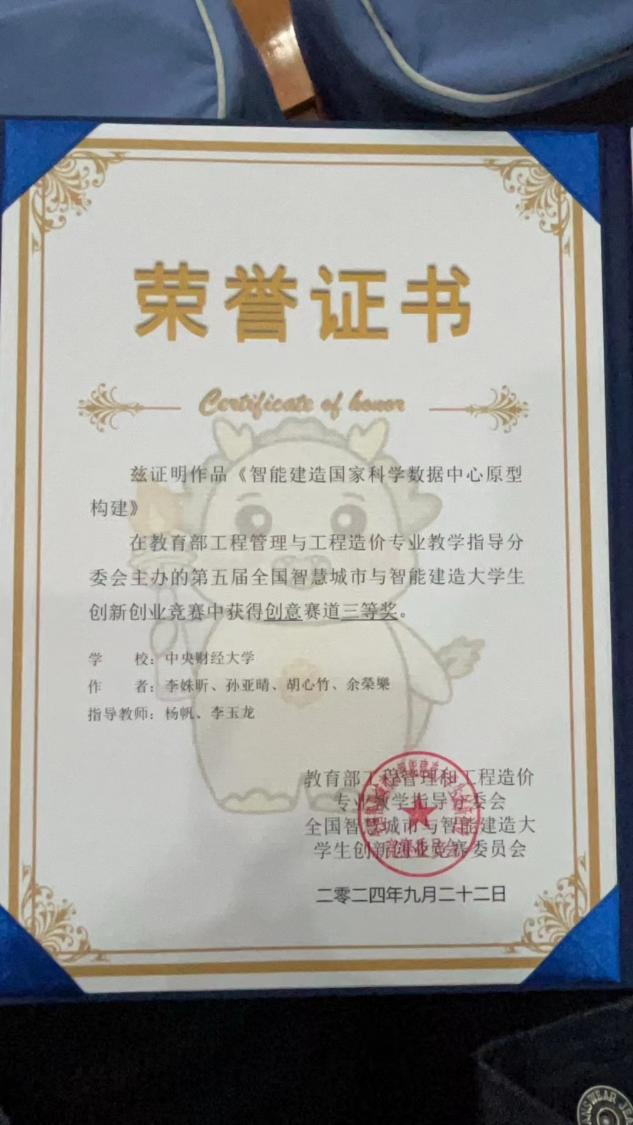 公司本次参赛队伍时间紧、任务重,在暑假最后短短十天时间,与指导教师紧密沟通,团队分工合作,完成了《智能建造国家科学数据中心原型构建》的参赛作品,成功通过复赛的函评阶段进入到全国总决赛,在教育部教指委、住建部评估委等答辩专家面前展示了中财工程管理专业员工创新创业风采,并最终荣获全国三等奖。