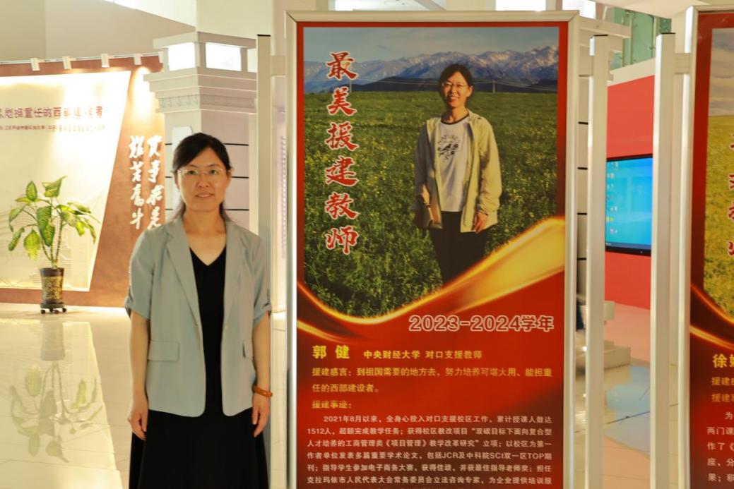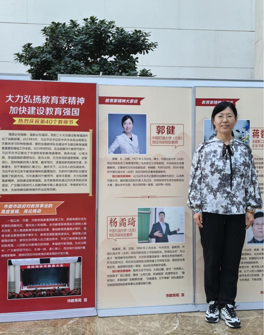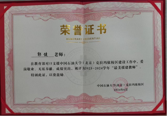郭健教授四年如一日的辛勤付出和卓越贡献赢得了广泛认可。2024年,她荣获克拉玛依校区“2023-2024学年最美援建教师”称号。同年,在第40个教师节之际,她被克拉玛依校区推选为代表,参加克拉玛依市“弘扬教育家精神大家谈”活动,分享教育情怀与援疆感悟。