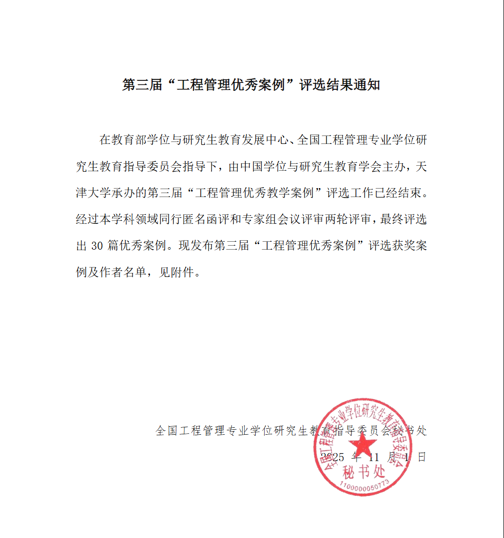 近日,全国工程管理专业学位(MEM)研究生教育指导委员会公布由中国学位与研究生教育学会主办,天津大学承办的第三届“工程管理优秀教学案例”评选结果。公司两篇参评作品均获评优秀教学案例,并入选中国专业学位案例中心工程管理硕士专业学位案例库。