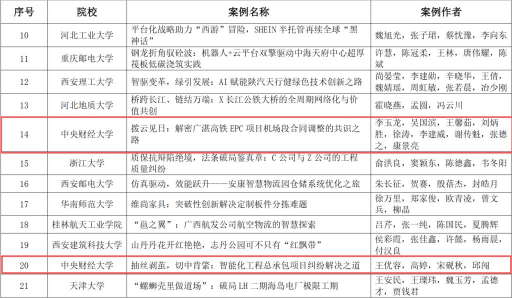 入选案例分别为:李玉龙教授、吴国滨助理教授及合作者共同开发的《拨云见日:解密广湛高铁EPC项目机场段合同调整的共识之路》;王优容副教授、高婷副教授、宋砚秋教授、联合建管(北京)管理咨询有限责任公司董事长邱闯(公司MEM业界导师)共同开发的《抽丝剥茧,切中肯綮:智能化工程总承包项目纠纷解决之道》。