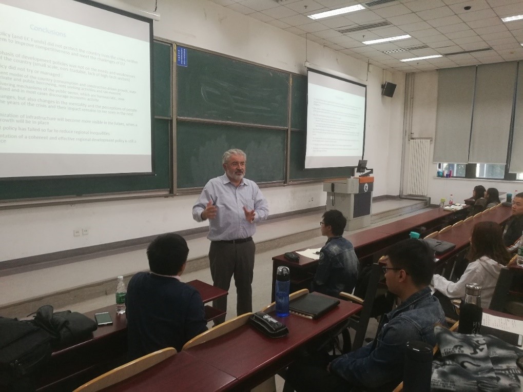 同学们认真聆听教授授课,在两天授课过程中的交流环节提出了不少高质量的问题,包括希腊国内的金融体系如何、希腊方面如何看待中国的投资目的以及希腊的官僚主义具体体现等。Petrakos教授对同学们的问题赞赏有加并一一解答,同学们在交流过程中都受益匪浅。