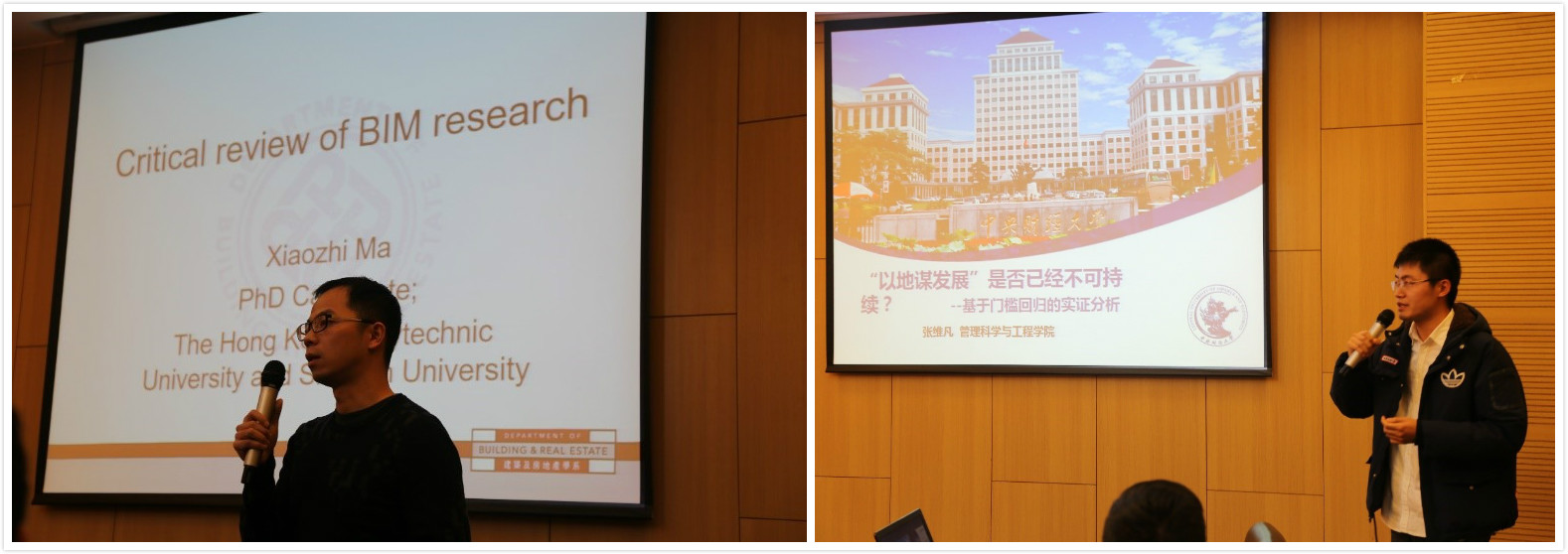 随后则是来自香港理工大学的马骁智发表了主题为“Introduction of HKPOLYU CIBSC & Critical Review of BIM Research”的汇报,详细回顾了建筑信息模型(BuildingInformationModeling,BIM)相关研究并进行分类和文献计量,说明了相关研究主要内容和发展方向。最后则是来自HAHA体育投资系博士生张维凡发表了主题为“以地谋发展”是否已经不可持续?——基于门槛回归的实证分析”的汇报演讲,首先他介绍了由于我国特殊国情导致的政府“以地谋发展”的基本情况,并基于2008-2015年265个地级市面板数据,采用门槛回归模型实证检验了地方政府“以地谋发展”的发展模式是否还可持续问题。最后得到“以地谋发展”模式已经不可持续,不可持续的原因在东部与中西部地区不同的最终结论。