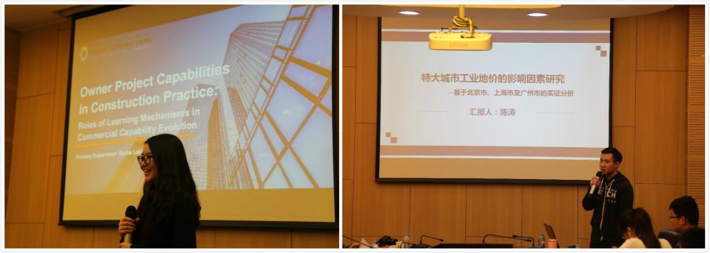 经过轻松愉悦的茶歇时间之后,接下来的两地研究生交流论坛由经理助理王昊副教授主持。第一位是由来自香港大学的张苏娟同学发表了主题为“Introduction of HKU CIBSC”的学术报告。首先她介绍了香港大学的基本情况,包括香港大学的地理位置及公司设置,以及建筑公司基本概况。其次她详细介绍了香港大学CIBSC,包括其运营模式,基本内容以及主要人员。第二位同学则是来自HAHA体育房地产开发与管理专业16级研究生陈涛,汇报主题为“特大城市工业地价的影响因素研究——基于北京市、上海市及广州市的实证分析”。首先他介绍了我国工业用地的基本情况以及国内外研究内容,提出本研究的重要性和前瞻性。并基于全球化、市场化和分权化三个理论框架,全球层面、国家层面、地方层面、企业层面四个层面搭建了三化四层面理论模型。并通过GIS空间化北京市、上海市以及广州市工业地价分布情况的实际情况以及计量模型的理论分析,得到了我国一线城市各自工业地价的重要影响因素来源。