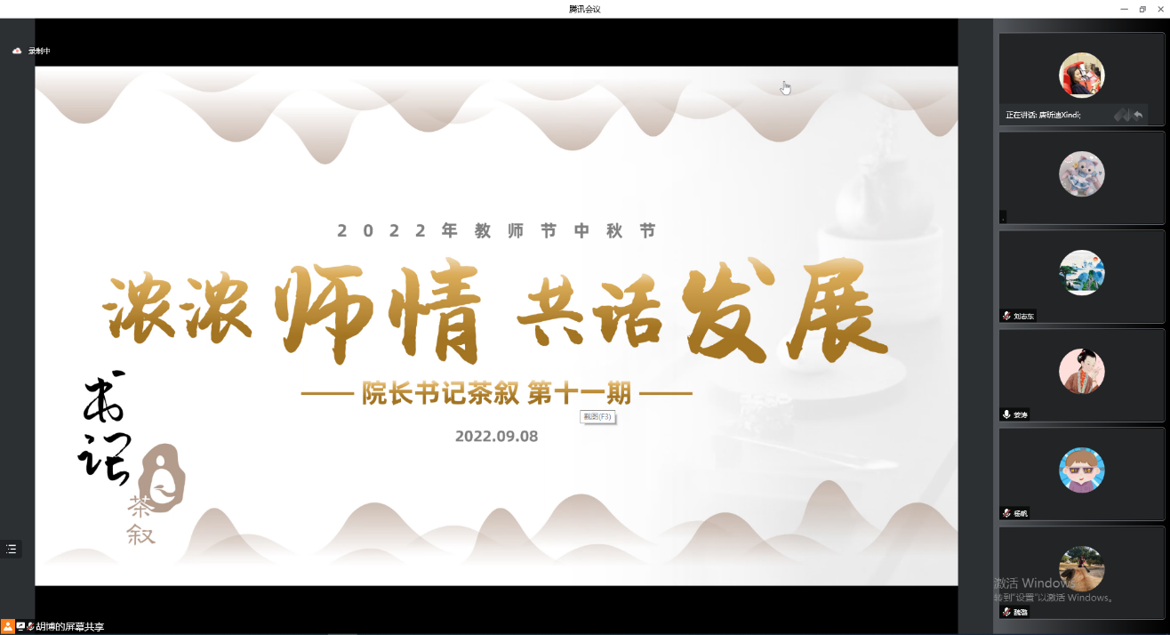 为庆祝第38个教师节,哈哈体育经理书记茶叙第11期——2022年教师节座谈会于9月8日下午通过腾讯会议的方式线上举行。经理刘志东、公司党委书记姜涛,系主任、教工党支部书记、中青年教师、海归教师、行政教师、新入职教师等各教师群体代表参加座谈。姜涛主持会议。