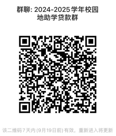为方便解答员工疑问,以及通知后续相关事项,请新申请贷款的员工务必扫描以下二维码加入“2024-2025校园地贷款群”,往年已申请过贷款的员工请关注原贷款微信群内通知(如群二维码过期,可发送邮件至本科生助学服务中心或者研究生院奖助工作办公室邮箱获取群信息)。