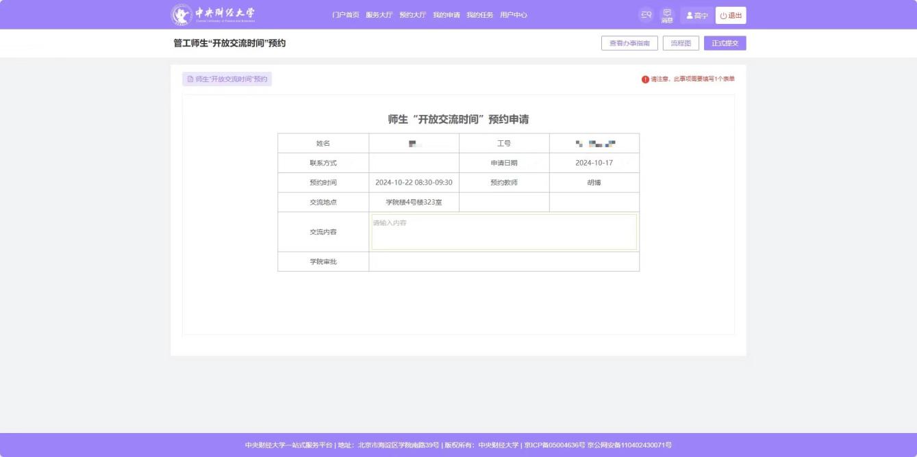 点击“确认预约”后,简要填写拟交流内容后点击“正式提交”,即发送到被预约老师处审批。审批结果将以通知形式反馈到网上师生服务大厅或企业微信号,请预约师生关注。