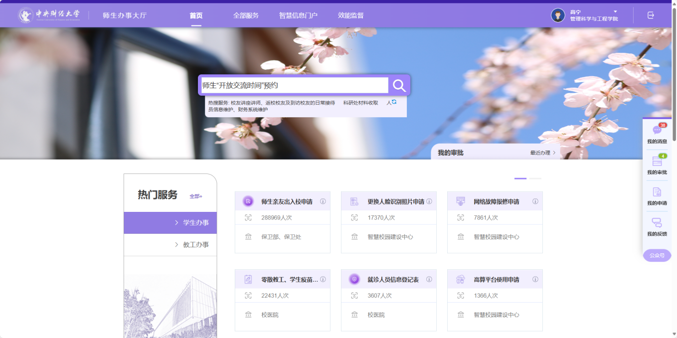 本学期起,公司师生“开放交流时间”使用公司网上办事大厅进行预约,在搜索栏中搜索【师生开放交流时间预约(管工公司)】即可进入预约入口。