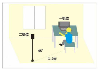 (1)考生“双机位”要求。“第一机位”采集考生音、视频源(考生正前方);“第二机位”采集考生“第一机位”显示器及考生所处环境的整体情况(远端)。“第二机位”须可自由移动,考试过程中考生须根据考官指令随时变换机位位置。“双机位”涉及的硬件设备的电脑桌面以及手机不得存放考试相关的电子资料。考生需要准备可以支撑“双机位”运行的硬件,即需要两部带摄像头的设备及附件,包括笔记本电脑、手机、手机支架等。第一机位(建议电脑端)从正面拍摄,放置在距离本人30cm 处;第二机位(建议手机端或者电脑端)从考生侧后方45°距离本人100cm 处拍摄,确保第一机位和第二机位分别从考生面前和身后完整拍摄到考生上半身、复试组教师能够从第二机位清晰看到第一机位屏幕。参照下图(二机位可以是电脑,如果是手机建议横屏放置):
