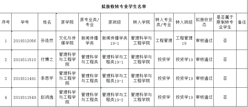 哈哈体育转专业分流工作小组根据对2020年申请转入公司的申请人材料的初审、转专业相关专业内容的考试,决定录取以下同学,并对具体名单予以公示。公示时间7月10号到7月13号,公示期间,如有相关意见和建议请联系,15210988078张志祥老师。