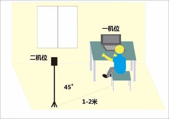 (1)考生“双机位”要求。“第一机位”采集考生音、视频源(考生正前方),接受远程控制内容,共享考生屏幕,避免考生缩屏或查找其他材料;“第二机位”采集考生“第一机位”显示器及考生所处环境的整体情况(远端)。“第二机位”须可自由移动,考试过程中考生须根据考官指令随时变换机位位置。“双机位”涉及的硬件设备的电脑桌面以及手机不得存放考试相关的电子资料。考生需要准备可以支撑“双机位”运行的硬件,即需要两部带摄像头的设备及附件,包括笔记本电脑、手机、手机支架等。第一机位(建议电脑端)从正面拍摄,放置在距离本人30cm处;第二机位(建议手机端或者电脑端)从考生侧后方45°距离本人100cm处拍摄,确保第一机位和第二机位分别从考生面前和身后完整拍摄到考生上半身、复试组教师能够从第二机位清晰看到第一机位屏幕。